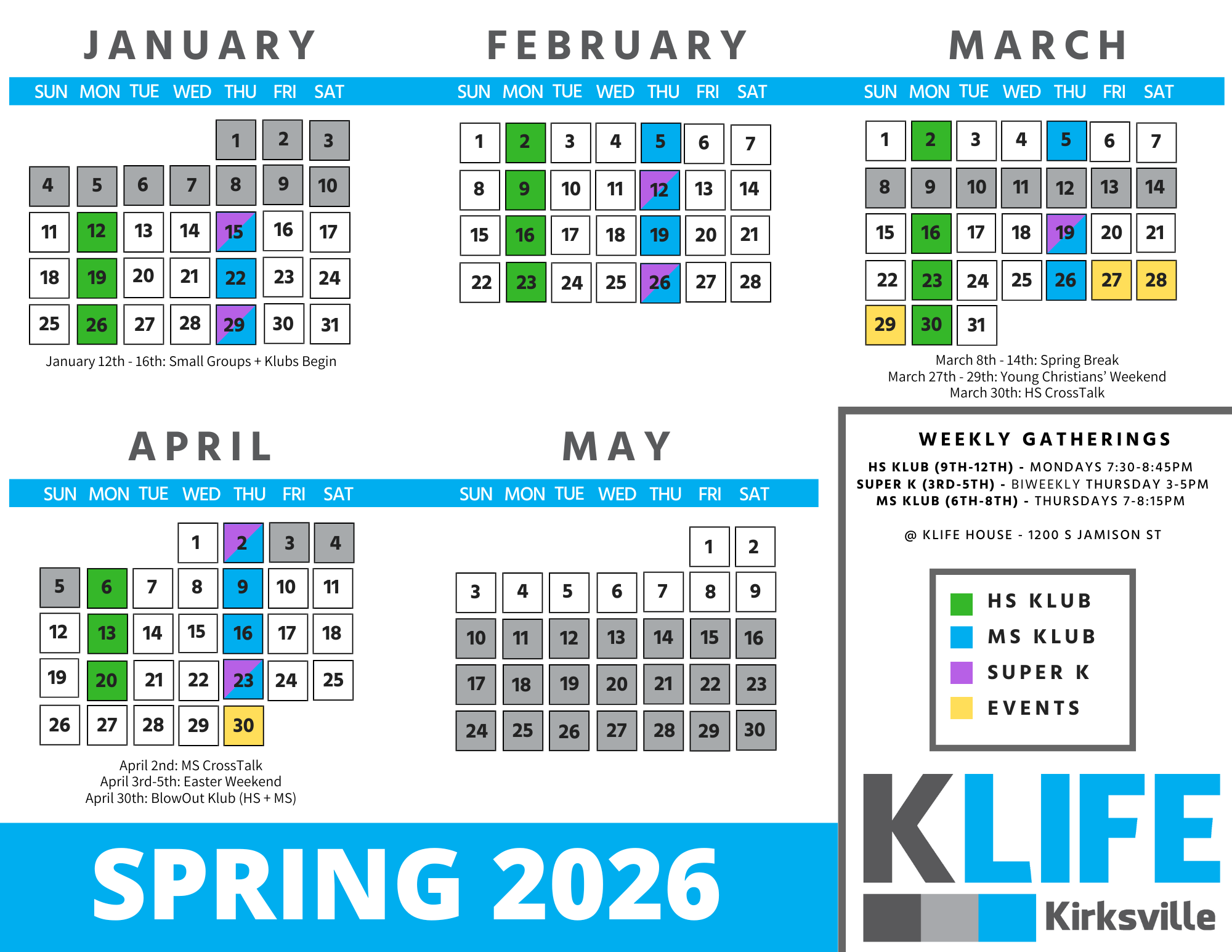 Every week we have Super K, there will be a Google Form sent out in the Monday Memo called Super K Registration (Date). Please fill out this form if you plan to have your student attend for the specified day. This allows us to communicate with the school (Ray Miller) who is attending KLIFE and who needs transportation home. It also ensures we have enough snacks for everyone!